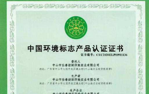 仕春紡織公司-中國(guó)環(huán)境標(biāo)志產(chǎn)品認(rèn)證證書(shū)1