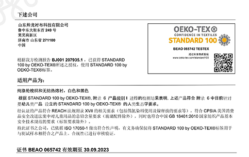 帥龍村布公司-Oeko-Tex 100生態(tài)紡織品認(rèn)證證書(shū)